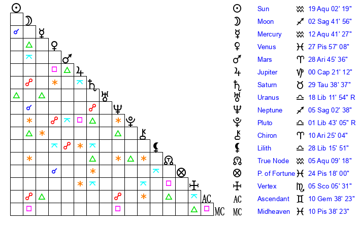 | Sun | 19 Aquarius 2 | 20 Aquarius 11 | 12 Aries 3 |