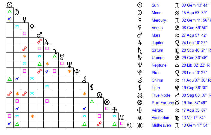 | Moon | 15 Aquarius 43 | 28 Cancer 11 | 2 Virgo 36 |