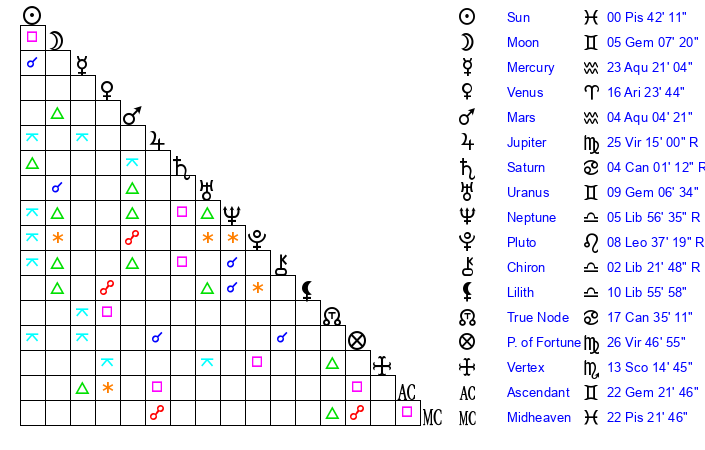 | Neptune | 5 Libra 57 | 28 Pisces 33 | 3 Libra 58 |