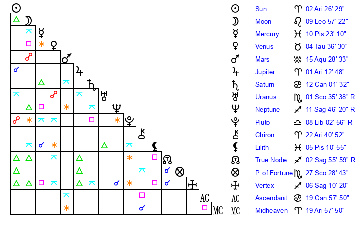 | Sun | 2 Aries 26 | 3 Aries 19 | 21 Taurus 20 |