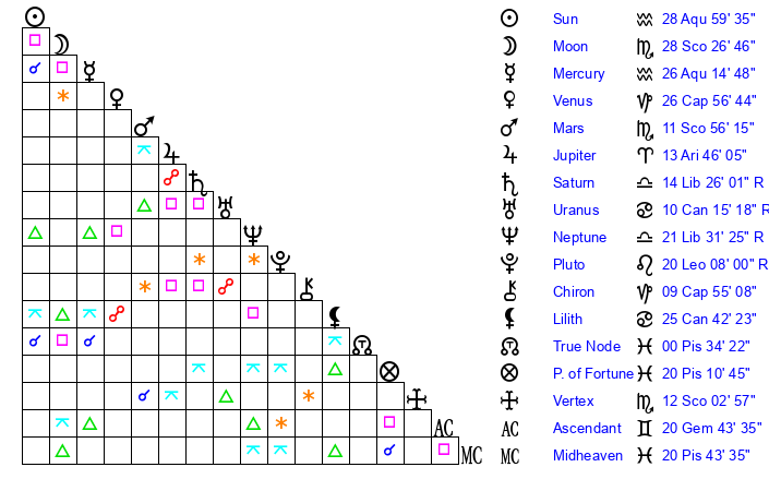 | Sun | 28 Aquarius 59 | 0 Pisces 17 | 11 Taurus 14 |