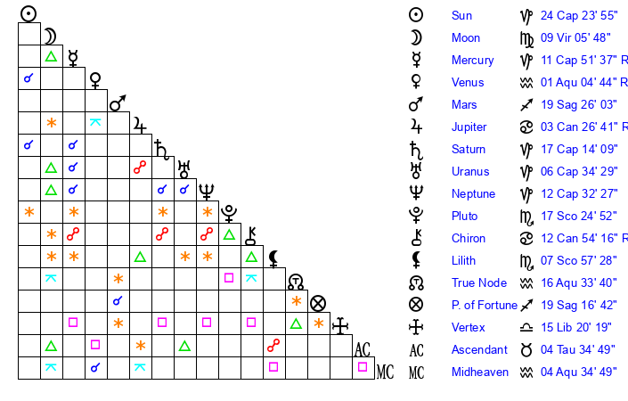 Sun | 24 Capricorn 24 | 24 Capricorn 55 | 29 Aquarius 54 |