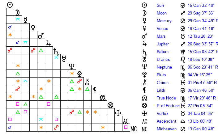 | Sun | 15 Cancer 33 | 15 Cancer 50 | 17 Virgo 58 |