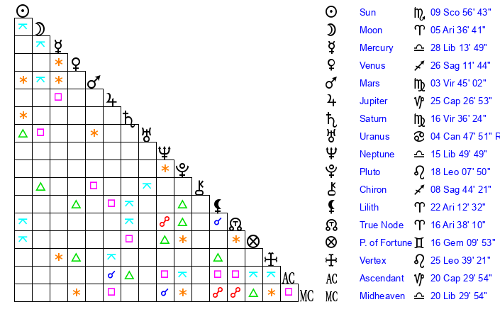 | Neptune | 15 Libra 50 | 29 Pisces 44 | 17 Libra 21 |