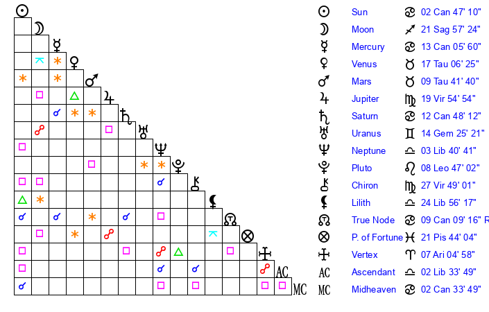 | Sun | 2 Cancer 47 | 3 Cancer 26 | 19 Virgo 33 |