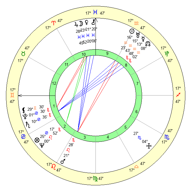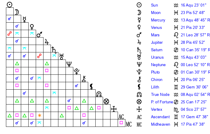 Sun | 16 Aquarius 23 | 17 Aquarius 57 | 3 Gemini 55 |