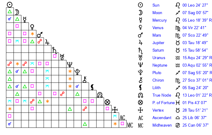 | Moon | 7 Sagittarius 4 | 16 Cancer 48 | 21 Scorpio 27 |