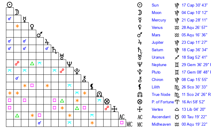 | Saturn | 19 Capricorn 4 | 26 Pisces 34 | 28 Capricorn 17 |