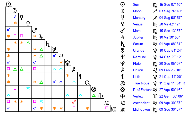 | Sun | 15 Scorpio 7 | 16 Scorpio 7 | 18 Sagittarius 28 |