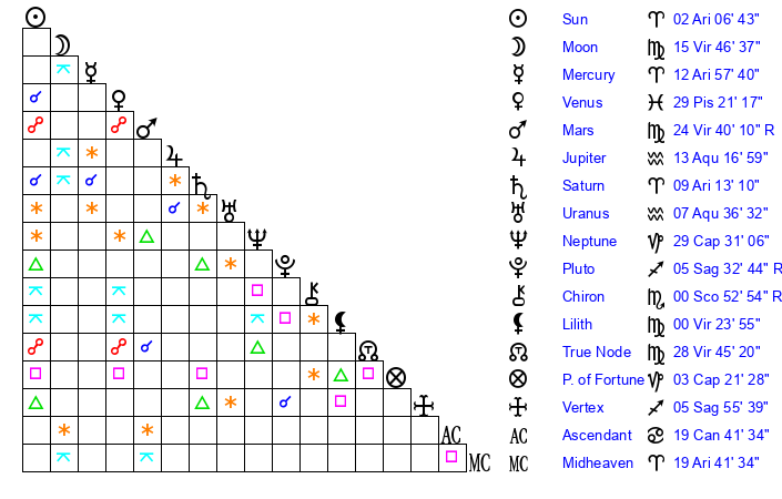 | Sun | 2 Aries 6 | 2 Aries 19 | 29 Aries 40 |