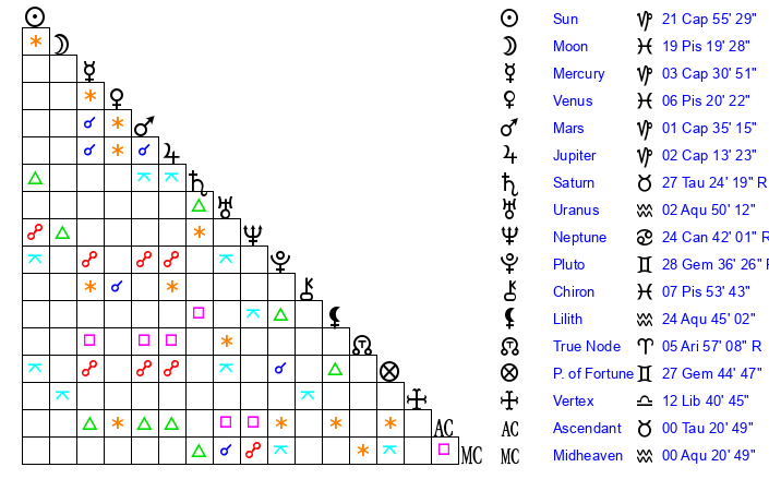 | Sun | 21 Capricorn 55 | 22 Capricorn 45 | 13 Taurus 36 |