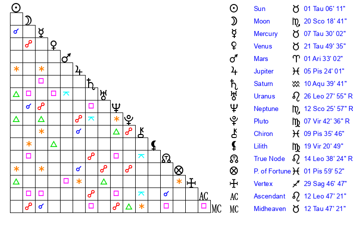 | Venus | 21 Taurus 50 | 26 Pisces 2 | 7 Leo 38 |