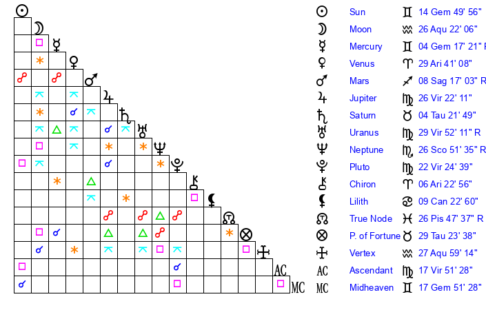 | Pluto | 22 Virgo 24 | 3 Aquarius 35 | 23 Virgo 17 |