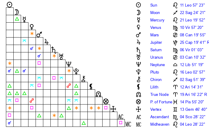 | Moon | 22 Sagittarius 21 | 17 Sagittarius 34 | 25 Virgo 9 |