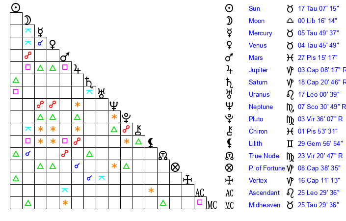 | Sun | 17 Taurus 7 | 17 Taurus 23 | 19 Cancer 22 |