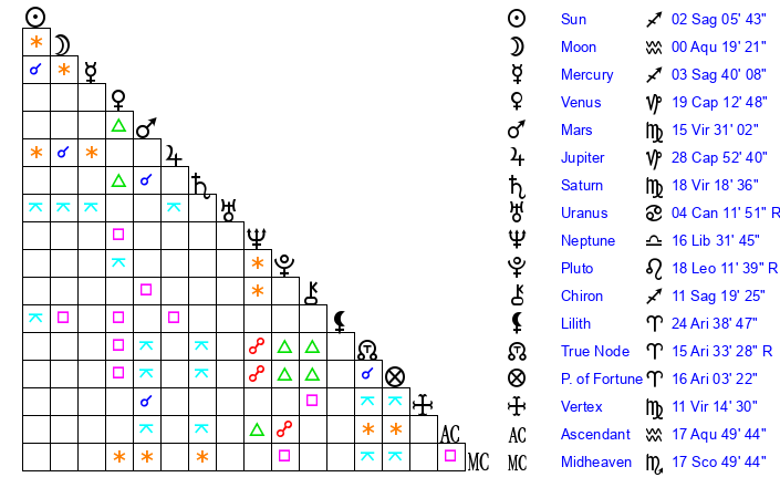 | Sun | 2 Sagittarius 6 | 2 Sagittarius 40 | 19 Aquarius 23 |