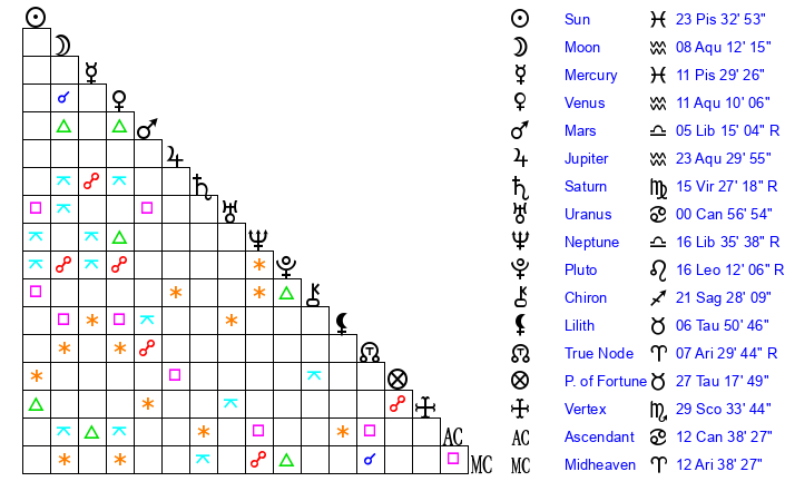 | Saturn | 16 Virgo 1 | 22 Pisces 18 | 13 Virgo 15 |