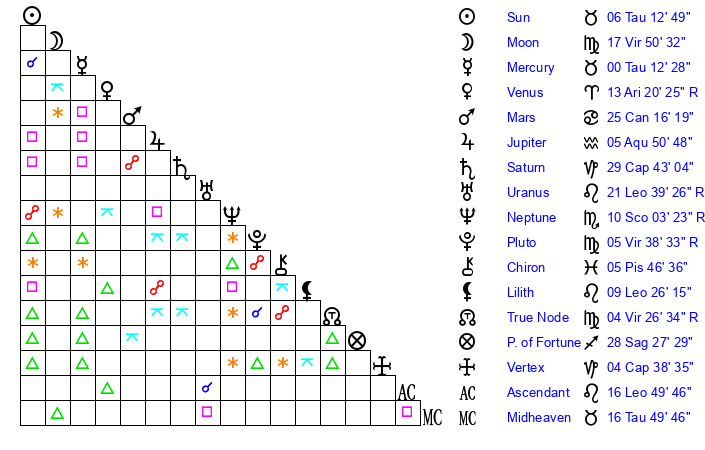 | Uranus | 21 Leo 41 | 26 Taurus 6 | 23 Leo 16 |