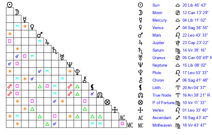 | Saturn | 15 Virgo 7 | 26 Pisces 41 | 19 Virgo 57 |
