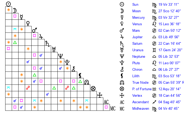 | Sun | 19 Virgo 33 | 20 Virgo 11 | 9 Sagittarius 9 |