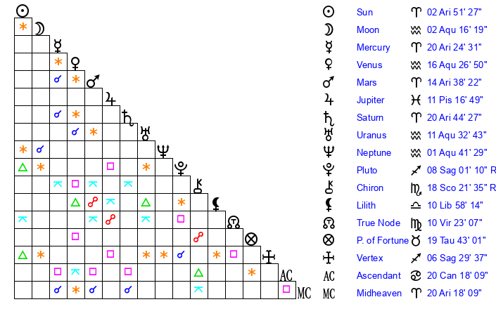 | Venus | 16 Aquarius 27 | 2 Aries 15 | 14 Pisces 22 |