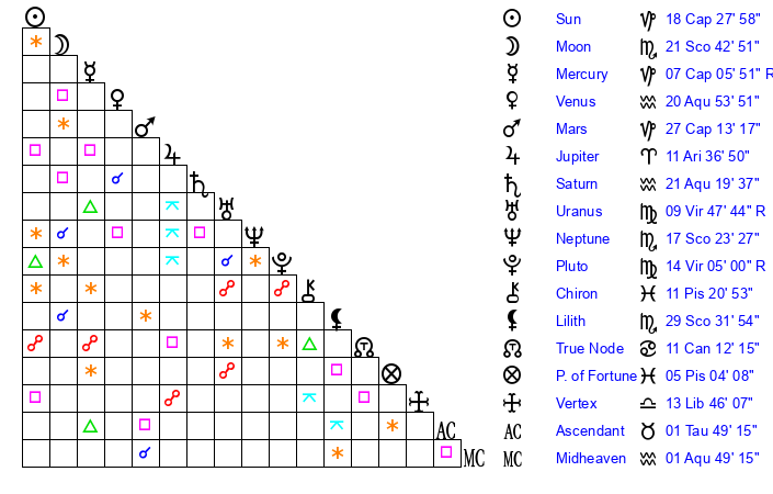 | Neptune | 17 Scorpio 23 | 27 Pisces 26 | 17 Scorpio 42 |
