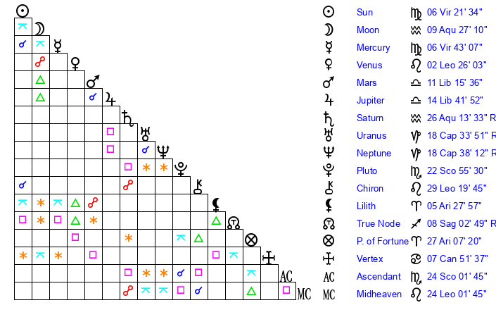 | Saturn | 26 Aquarius 8 | 0 Aries 3 | 24 Aquarius 10 |
