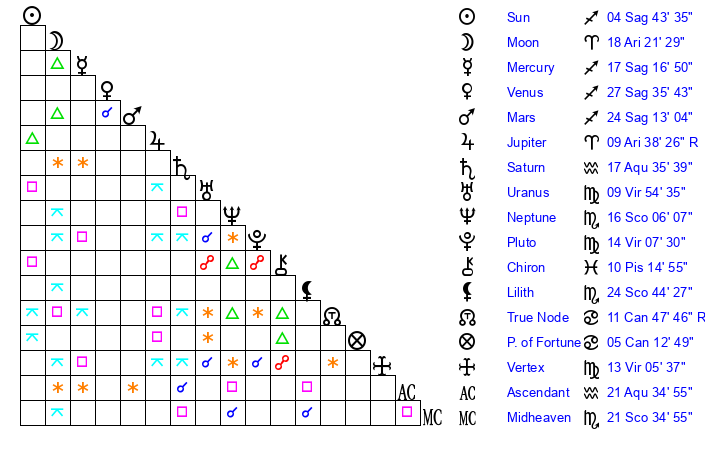 | Sun | 4 Sagittarius 44 | 5 Sagittarius 42 | 7 Aquarius 49 |