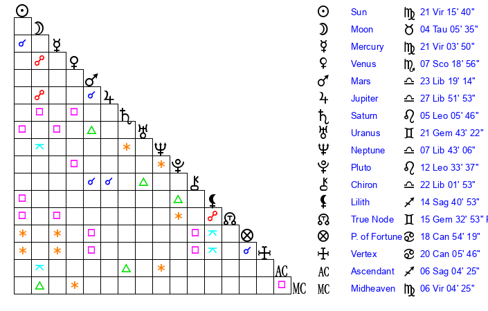 | Sun | 21 Virgo 16 | 22 Virgo 8 | 9 Sagittarius 55 |