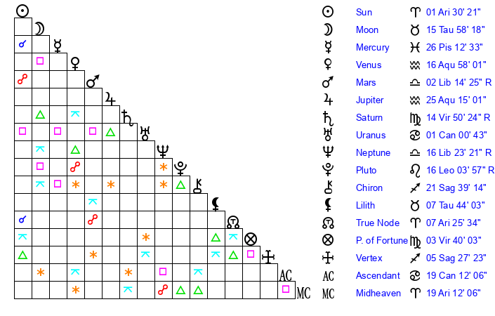 | Sun | 1 Aries 30 | 2 Aries 19 | 14 Gemini 27 |
