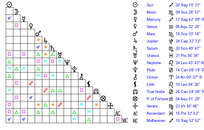 | Mercury | 17 Sagittarius 42 | 0 Sagittarius 57 | 14 Aries 39 |