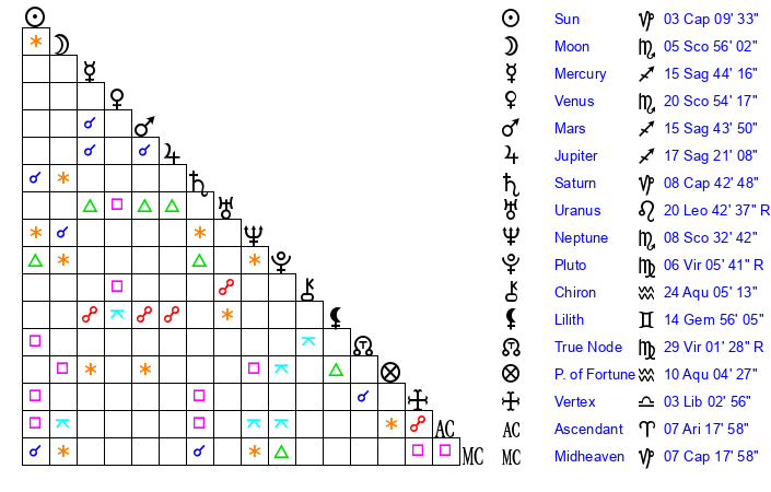 | Venus | 20 Scorpio 54 | 1 Capricorn 17 | 11 Aquarius 5 |