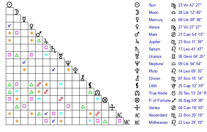 | Sun | 23 Virgo 43 | 24 Virgo 49 | 11 Sagittarius 27 |
