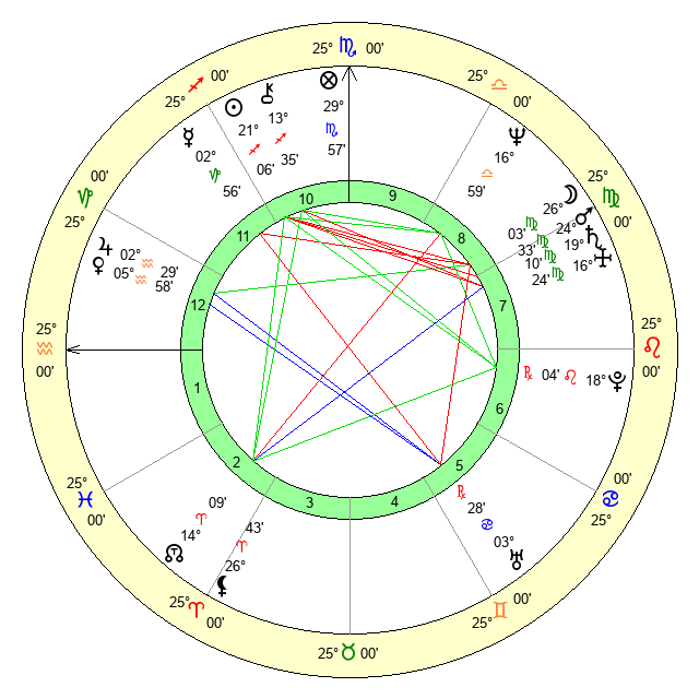 | Saturn | 19 Virgo 41 | 25 Pisces 16 | 17 Virgo 13 |