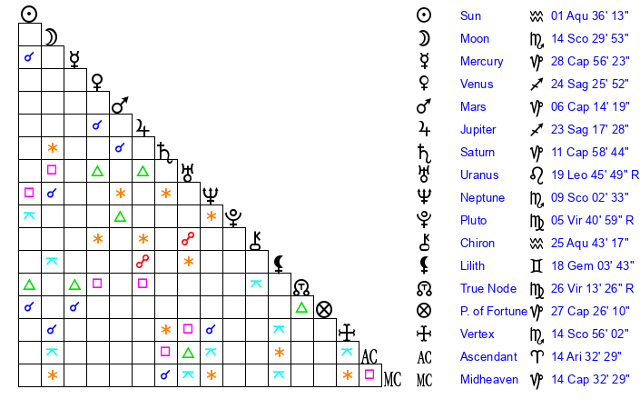 | Sun | 1 Aquarius 36 | 2 Aquarius 50 | 6 Aries 57 |