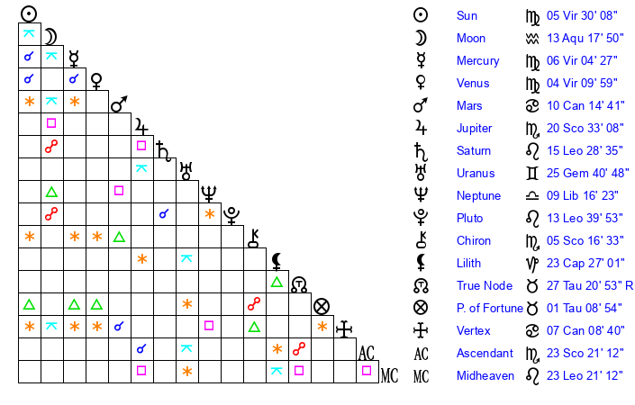 | Sun | 5 Virgo 30 | 6 Virgo 36 | 22 Scorpio 29 |