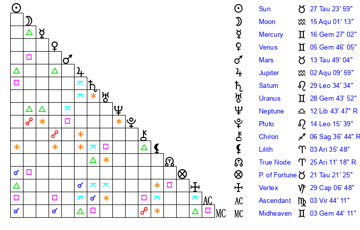 | Mercury | 16 Gemini 27 | 14 Taurus 54 | 17 Leo 27 |