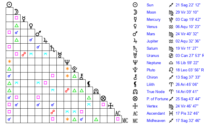 | Saturn | 19 Virgo 41 | 25 Pisces 17 | 17 Virgo 12 |