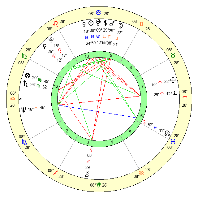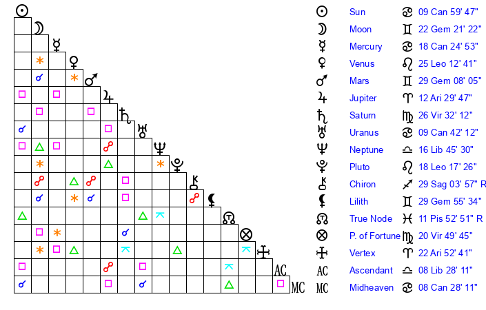 | Sun | 9 Cancer 59 | 11 Cancer 4 | 21 Virgo 4 |