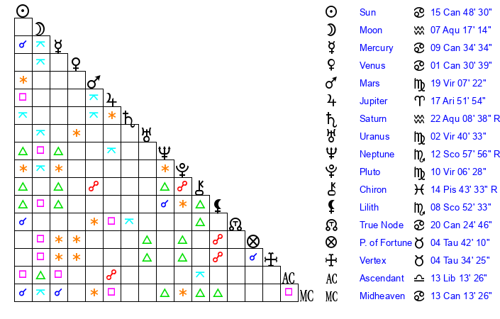 | Neptune | 12 Scorpio 57 | 2 Aries 10 | 13 Scorpio 24 |