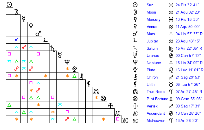 | Saturn | 15 Virgo 56 | 22 Pisces 25 | 13 Virgo 17 |