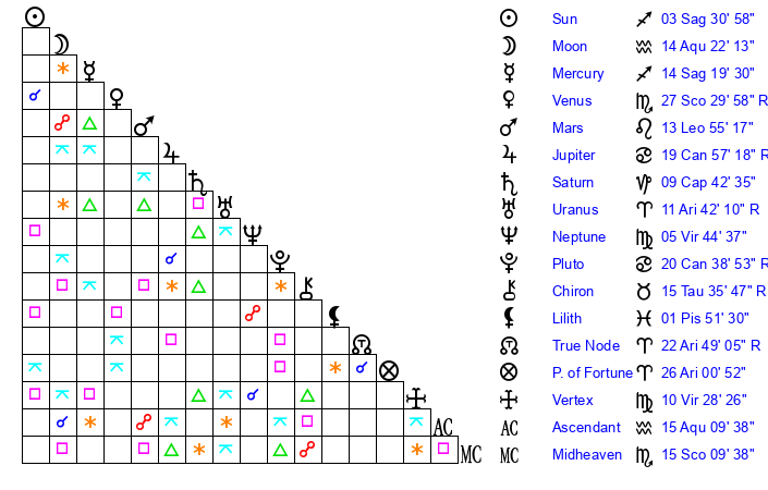 Moon | 14 Aquarius 30 | 12 Libra 6 | 14 Cancer 10 |