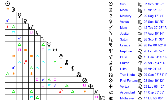 | Sun | 7 Scorpio 31 | 8 Scorpio 31 | 17 Aquarius 56 |