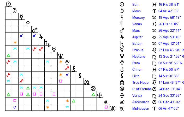 | Moon | 4 Aries 43 | 0 Cancer 21 | 28 Cancer 12 |
