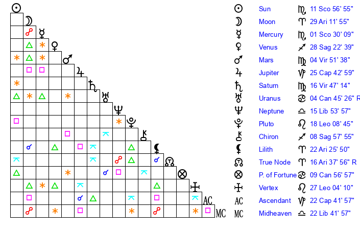| Sun | 11 Scorpio 57 | 12 Scorpio 32 | 29 Capricorn 4 |