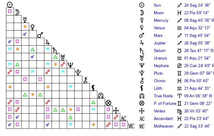 | Sun | 24 Sagittarius 24 | 25 Sagittarius 14 | 17 Aries 16 |