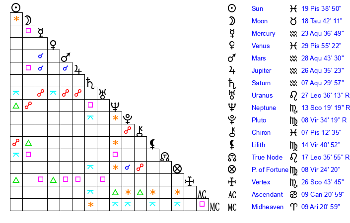 | Moon | 18 Taurus 43 | 9 Leo 35 | 4 Virgo 19 |
