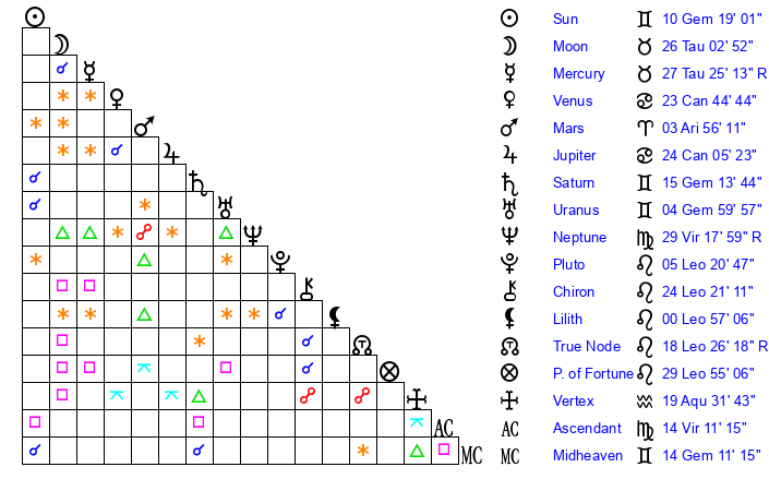 | Sun | 10 Gemini 19 | 11 Gemini 27 | 28 Leo 43 |