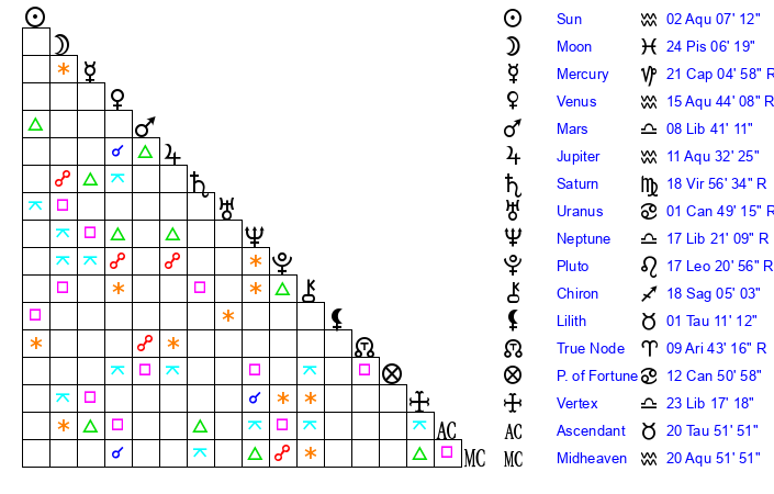 | Venus | 15 Aquarius 44 | 19 Pisces 29 | 1 Pisces 1 |
