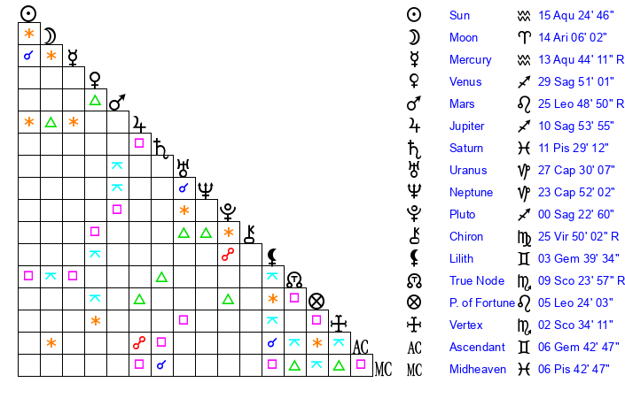 | Venus | 29 Sagittarius 50 | 0 Aries 16 | 4 Aquarius 26 |